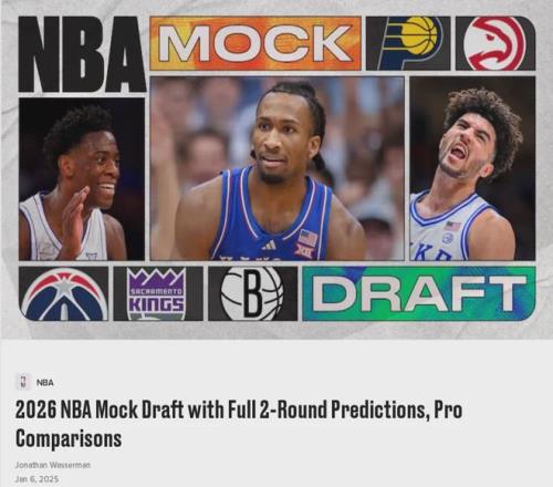 NBA權(quán)威選秀專家Jonathan Wasserman發(fā)布最新一期2026年模擬選秀榜單,卡洛斯-布澤爾的兒子卡梅倫-布澤爾暫列第二。達(dá)林-彼得森高居第一,該選秀專家預(yù)測(cè)他將在第一順位被步行者選中。AJ-迪班薩排第三,凱萊布-威爾遜第四。