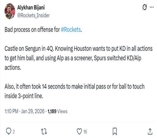 正如賽后火箭媒體人Alykhan Bijani所說:“火箭隊的進攻發(fā)起爛透了,馬刺用卡斯爾換防申京就直接破解了火箭隊的擋拆進攻,因為所有人都知道他們一定會將球交給杜蘭特?!?/p>