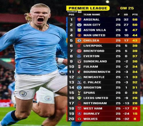北京時間2月9日凌晨,隨著本輪焦點戰(zhàn)利物浦主場遭曼城絕殺,英超第25輪十場比賽全部戰(zhàn)罷。阿森納3比0完勝桑德蘭,繼續(xù)6分領跑英超;曼城憑借哈蘭德93分鐘的制勝點球2比1力克利物浦,坐穩(wěn)次席,領先本輪打出平局的維拉3分;曼聯(lián)2比0擊敗熱刺,繼續(xù)排名第四,距離維拉3分;切爾西3比1擊敗狼隊,領先本輪輸球的利物浦4分,兩隊分列第五、第六。