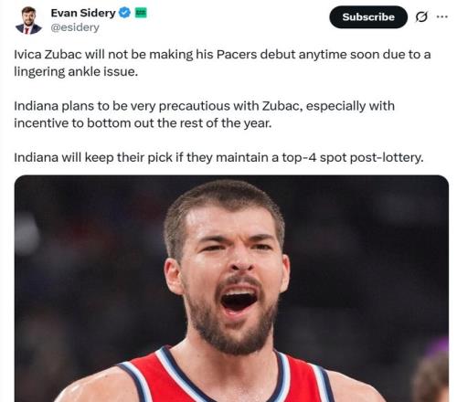 否則步行者也不會(huì)在交易截止日前大手筆引進(jìn)祖巴茨,后者在賽前被記者Evan Sidery曝出受困于腳踝傷勢,短期內(nèi)不會(huì)迎來球隊(duì)首秀。