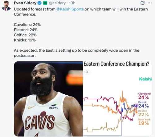自從得到哈登后,騎士隊(duì)競爭力飆升,已經(jīng)成為東部四支爭冠熱門之一,拿下東部冠軍的概率直接追平活塞并列東部第一。